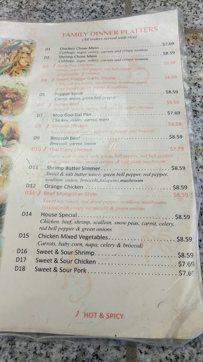 Hot and spicy. Served with fried rice and an egg roll.